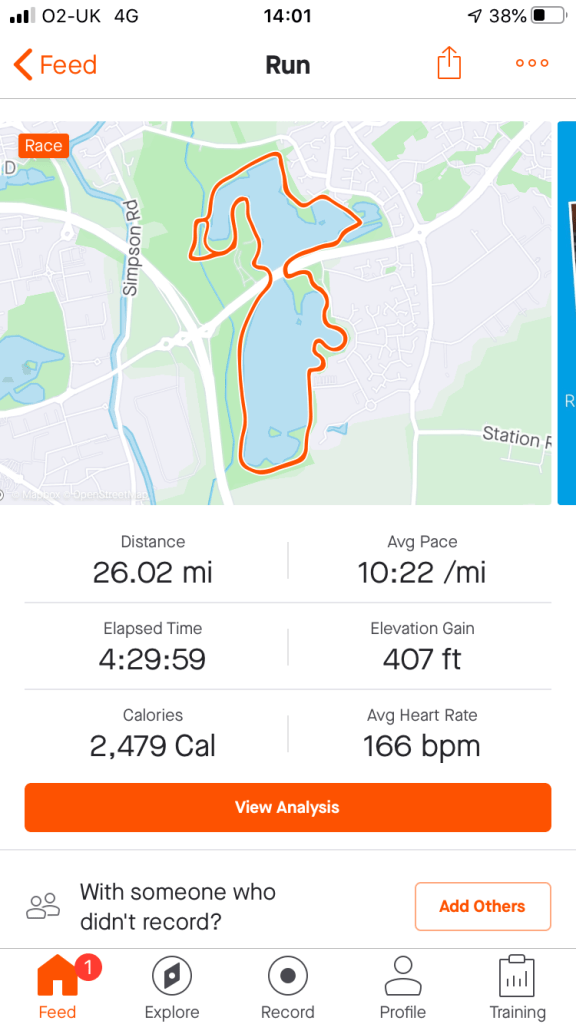 I really do! The first lapped race was Doha – 5.25km out along the corniche, 5.25km back, four times. I thought I might be bored but I LOVED it – I got to know the route and ticked off the main sights each time, I saw Tracey loads and we hi-fived as we passed and I just concentrated on the leg I was currently on rather than the distance I had run, it felt so much easier than an A-B which seems to go on forever! My February marathon in Pateley Bridge was 5 loops of 5 miles (plus a little out and back at the start), again it felt so much shorter than an A-B route. Then during lockdown I ran a marathon round the field next to my house, 23 1.1 mile laps, I changed direction every 5 laps and my family took it in turns to join me every third lap, the time and distance flew past. By the time I ran my August marathon in Milton Keynes, which was 7 laps of a lake, my love of lapped races was cemented (just not my love of 30-degree heat!).
